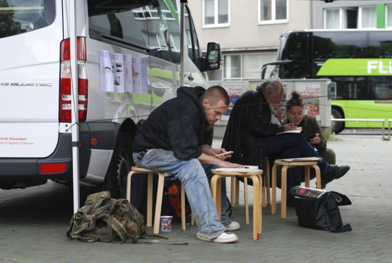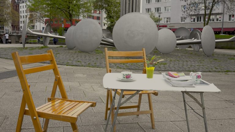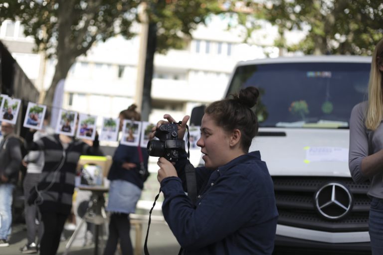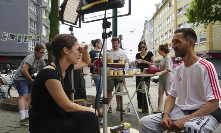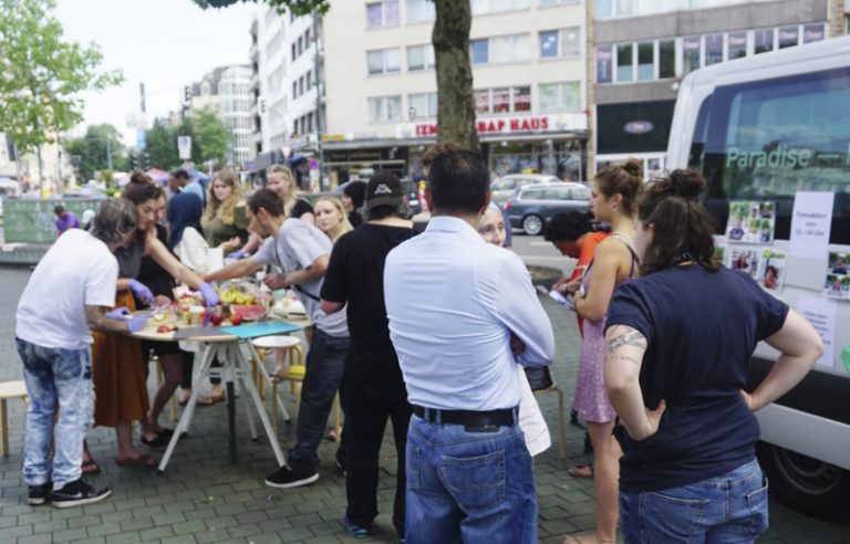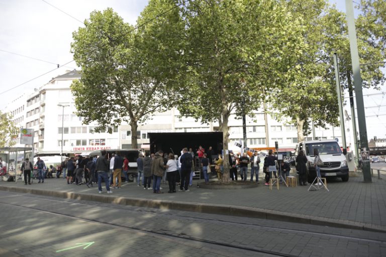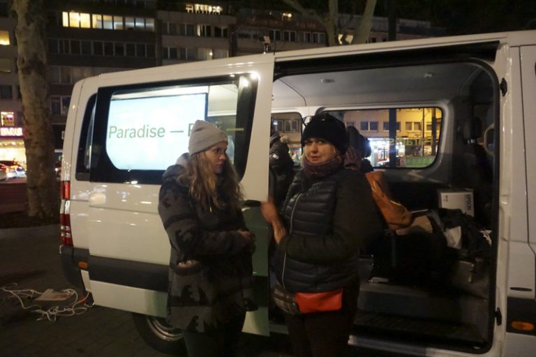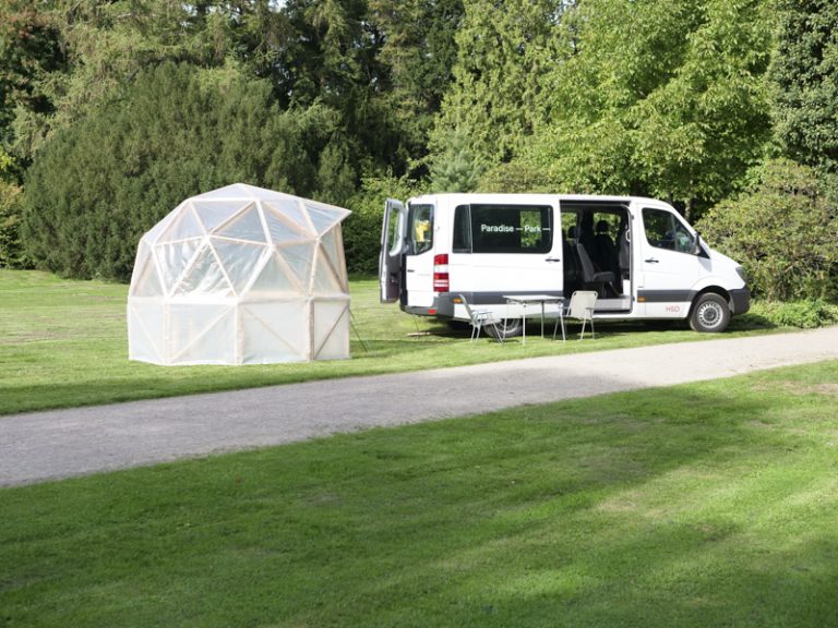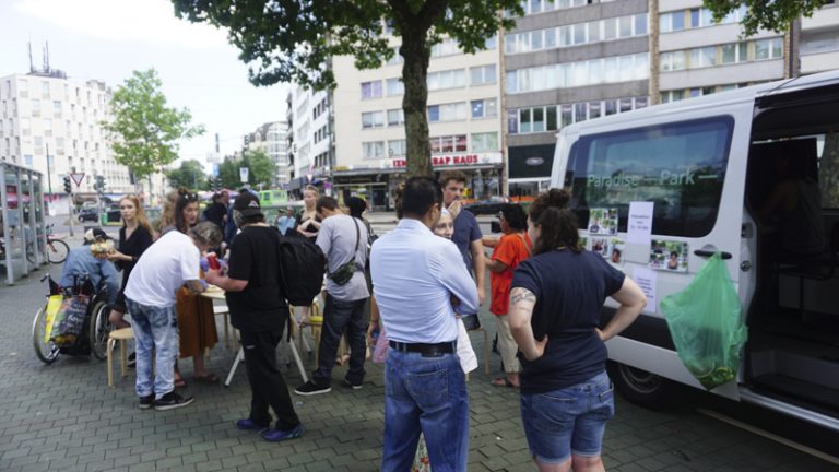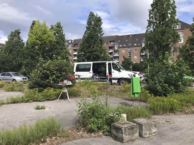 Paradise—Park— ist ein Ü-Wagen der HSD. Mit Filmstudierenden von Prof. Anja Vormann und Prof. Britta Wandaogo fährt er verschiedene Plätze in der Stadt an. Dort hält er sich einige Monate auf, um mit den Anwohnern über die Stadt, Politik und Planung ins Gespräch zu kommen. Grundlage sind Bilder. Sie werden gesammelt oder produziert. Sie formulieren Atmosphären, persönliche Stimmungen und ideale Orte. Sie fassen den Ort und produzieren davon ausgehend Planungsutopien. Sie widerstehen den architektonischen Visualisierungen, die die Realität aus dem Blick verlierend, Stadt zunehmend von oben und aus dem Virtuellen heraus erfassen.